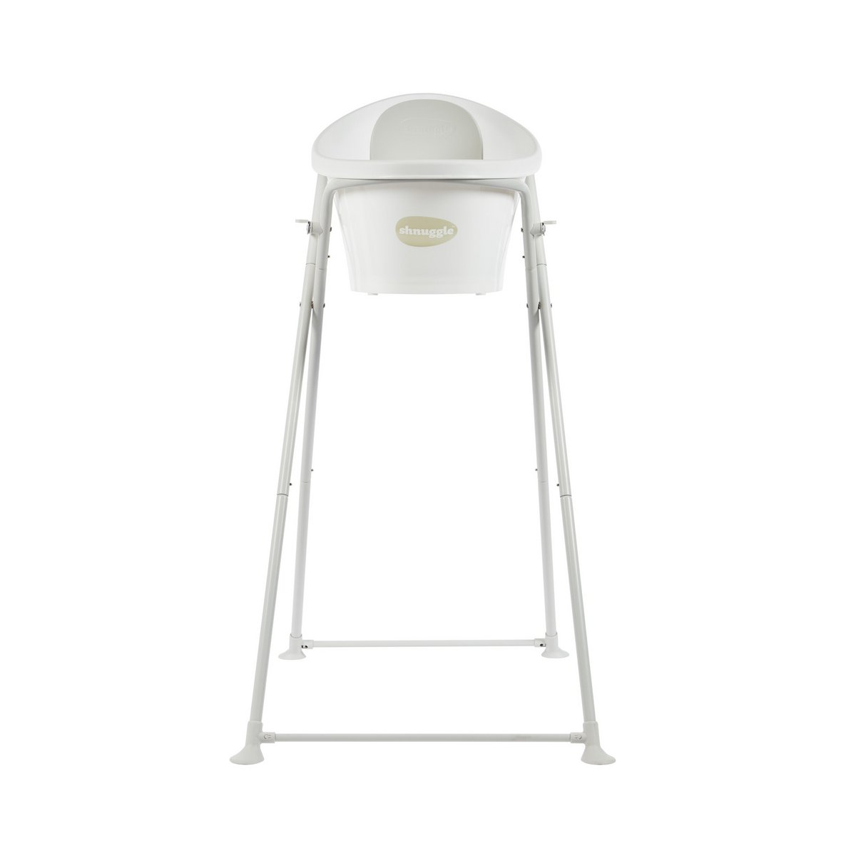 De opvouwbare Shnuggle-badstandaard verhoogt de Shnuggle-badkuip tot een hoogte van ongeveer 30 "van de vloer, zodat de baby zich op heuphoogte bevindt. Dit is vooral gunstig voor moeders en vaders met rugklachten of moeders die een keizersnede hebben gehad en die het anders de eerste weken moeilijk zouden vinden om de baby in bad te doen. De standaard kan ook gemakkelijk worden opgevouwen om op te bergen.